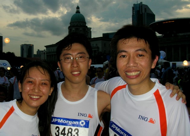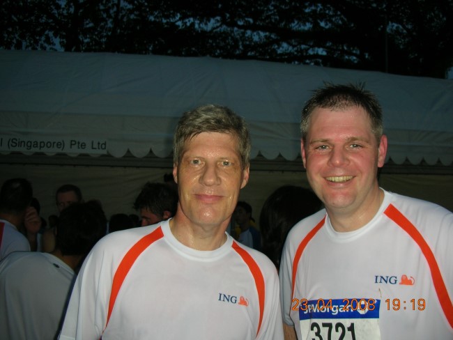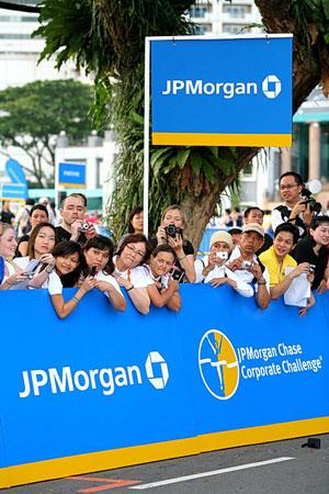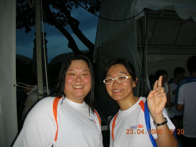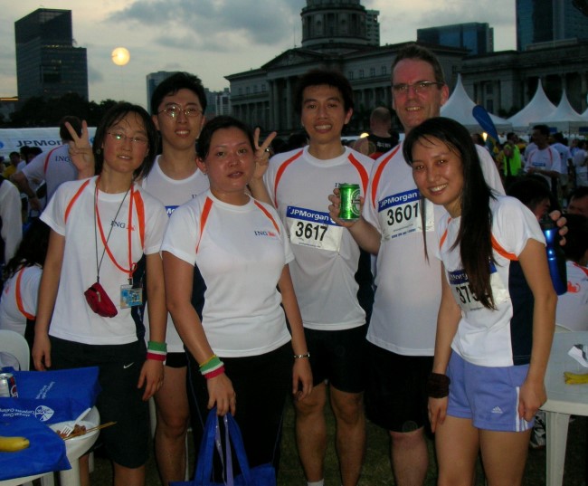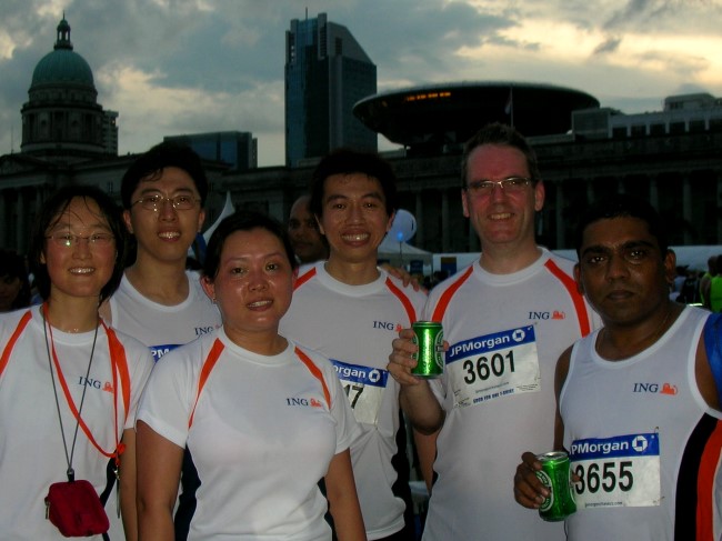 跑完后到广场上公司的休息站吃喝,每家公司都有自己的站点,估计是跑糊涂了,我穿着我们公司的衣服大摇大摆的走到隔壁RBS公司那里拿了一罐雪碧
